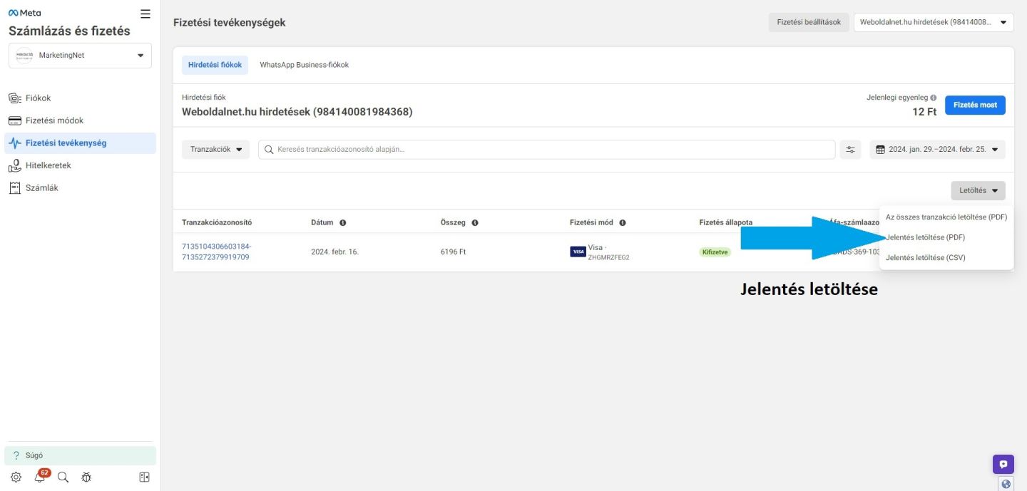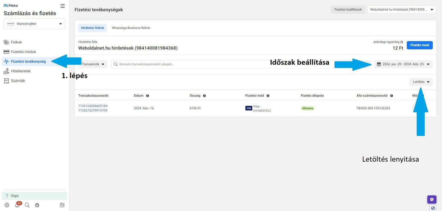 Kiválasztani azt a hirdetési fiókot amiből szeretnéd letölteni az adatokat. Ezután Fizetési tevékenység -> Időszak beállítása (Élettartam)
