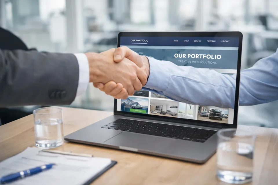 mosolygó üzletember laptop előtt, kézfogás fehér háttérrel, tökéletes irodák tökéletes emberekkel.